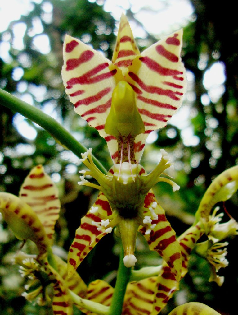Robert Dressler and fellow Garden botanist James Folsom found this orchid in 1977 Panama at an altitude of 2,800 feet. The species has since been found as high as 5,000 feet. Unlike most orchids, its flower bud doesn’t twist 180 degrees before it opens.