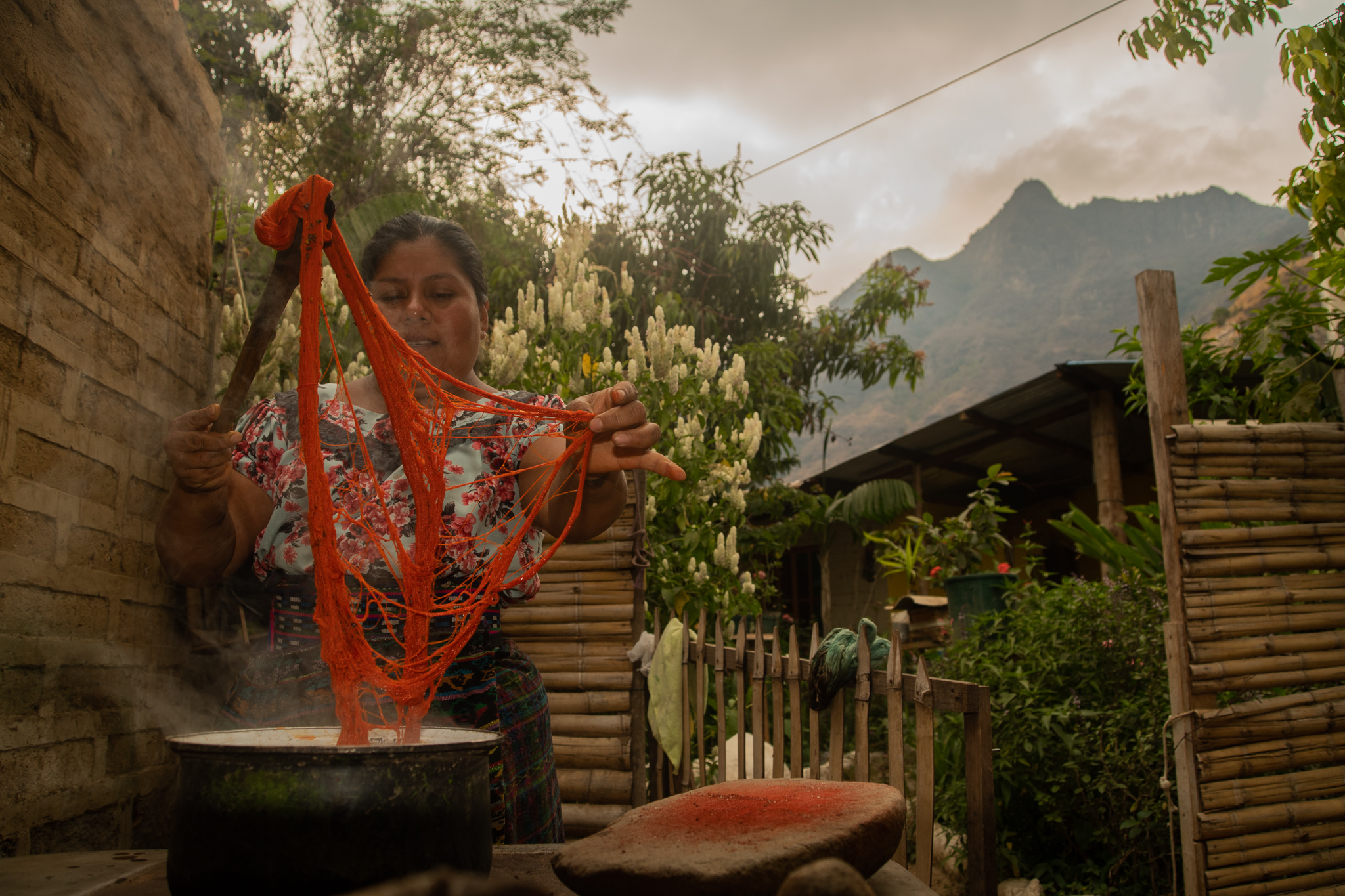 Preparation of the plant and mordant: Both dried and fresh plants are used, but fresh plants provide stronger and more intense colors. When there are seeds, as in the case of Achiote (Bixa orellana L.), they are used dry. Barks and roots are dried and then left to rest in water at least one night prior to use so that they release the dye better. The part of the plant being used is crushed or cut into pieces and placed in a container of water to be cooked for several hours. Mordant, an important non-dye element that acts to fix the dye colors on to the fibers, is sometimes added. Mordant is another natural element, often a plantain or banana stem.